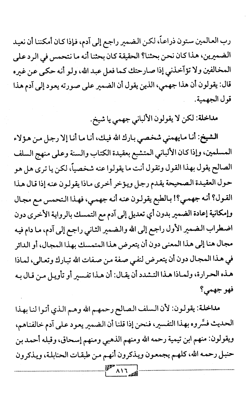 الشيخ: أنا مايهمني شخصي بارك الله فيك، أنا ما أنا إلا رجل من هؤلاء المسلمين، وإذا كان الألباني المتشبع بعقيدة الكتاب والسنة وعلى منهج السلف الصالح يقول بهذا القول وتقول أنت ما يقولوا عنه شخصياً، لكن يا ترى هل هو حول العقيدة الصحيحة يقدم رجل ويؤخر أخرى ماذا يقولون عنه إذا قال هذا القول؟ أنه جهمي؟! بالطبع يقولون عنه أنه جهمي، فهذا التحمس مع مجال وإمكانية إعادة الضمير بدون أي تعديل إلى آدم مع التمسك بالرواية الأخرى دون اضطراب الضمير الأول راجع إلى الله والضمير الثاني راجع إلى آدم، ما دام فيه مجال هنا إلى هذا المعنى دون أن يتعرض هذا المتمسك بهذا المجال، أو الدائر في هذا المجال دون أن يتعرض لنفي صفة من صفات الله تبارك وتعالى، لماذا هذه الحرارة، ولماذا هذا التشدد أن يقال: أن هذا تفسير أو تأويل من قال به فهو جهمي؟