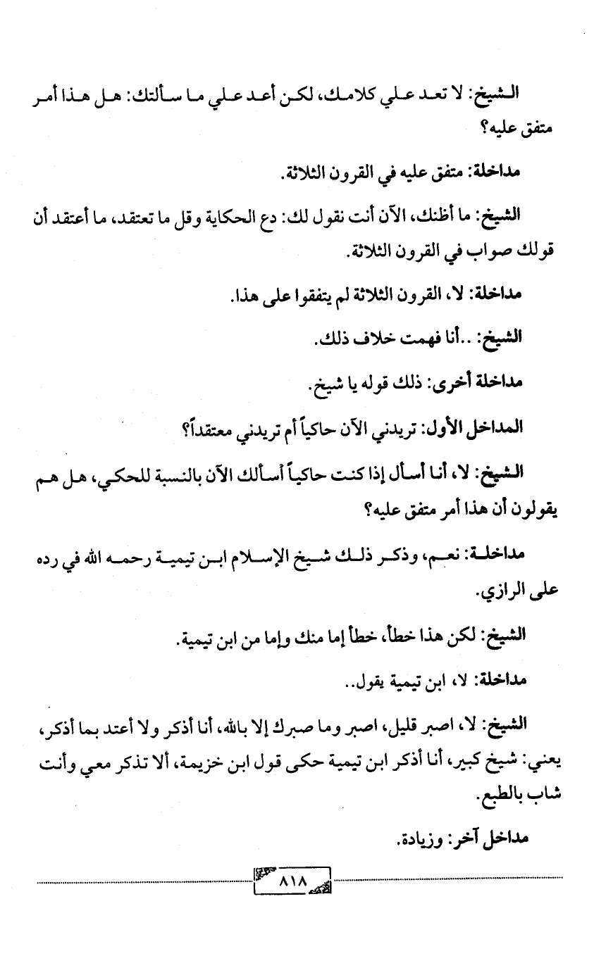 الشيخ: لا، اصبر قليل، اصبر وما صبرك إلا بالله، أنا أذكر ولا أعتد بما أذكر، يعني: شيخ كبير، أنا أذكر ابن تيمية حكى قول ابن خزيمة، ألا تذكر معي وأنت شاب بالطبع.