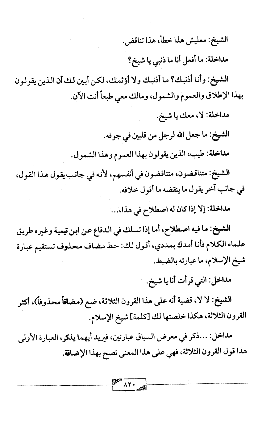 الشيخ: لا لا، قضية أنه على هذا القرون الثلاثة، ضع (مضافاً محذوفاً)، أكثر القرون الثلاثة، هكذا خلصتها لك [كلمة] شيخ الإسلام.