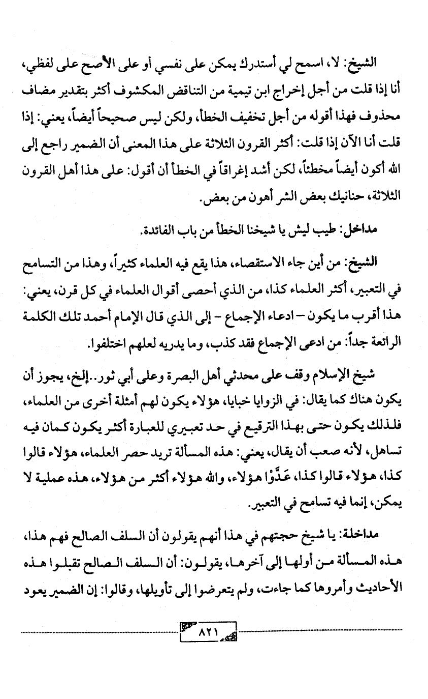 الشيخ: لا، اسمح لي أستدرك يمكن على نفسي أو على الأصح على لفظي، أنا إذا قلت من أجل إخراج ابن تيمية من التناقض المكشوف أكثر بتقدير مضاف محذوف فهذا أقوله من أجل تخفيف الخطأ، ولكن ليس صحيحاً أيضاً، يعني: إذا قلت أنا الآن إذا قلت: أكثر القرون الثلاثة على هذا المعنى أن الضمير راجع إلى الله أكون أيضاً مخطئاً، لكن أشد إغراقاً في الخطأ أن أقول: على هذا أهل القرون الثلاثة، حنانيك بعض الشر أهون من بعض.
