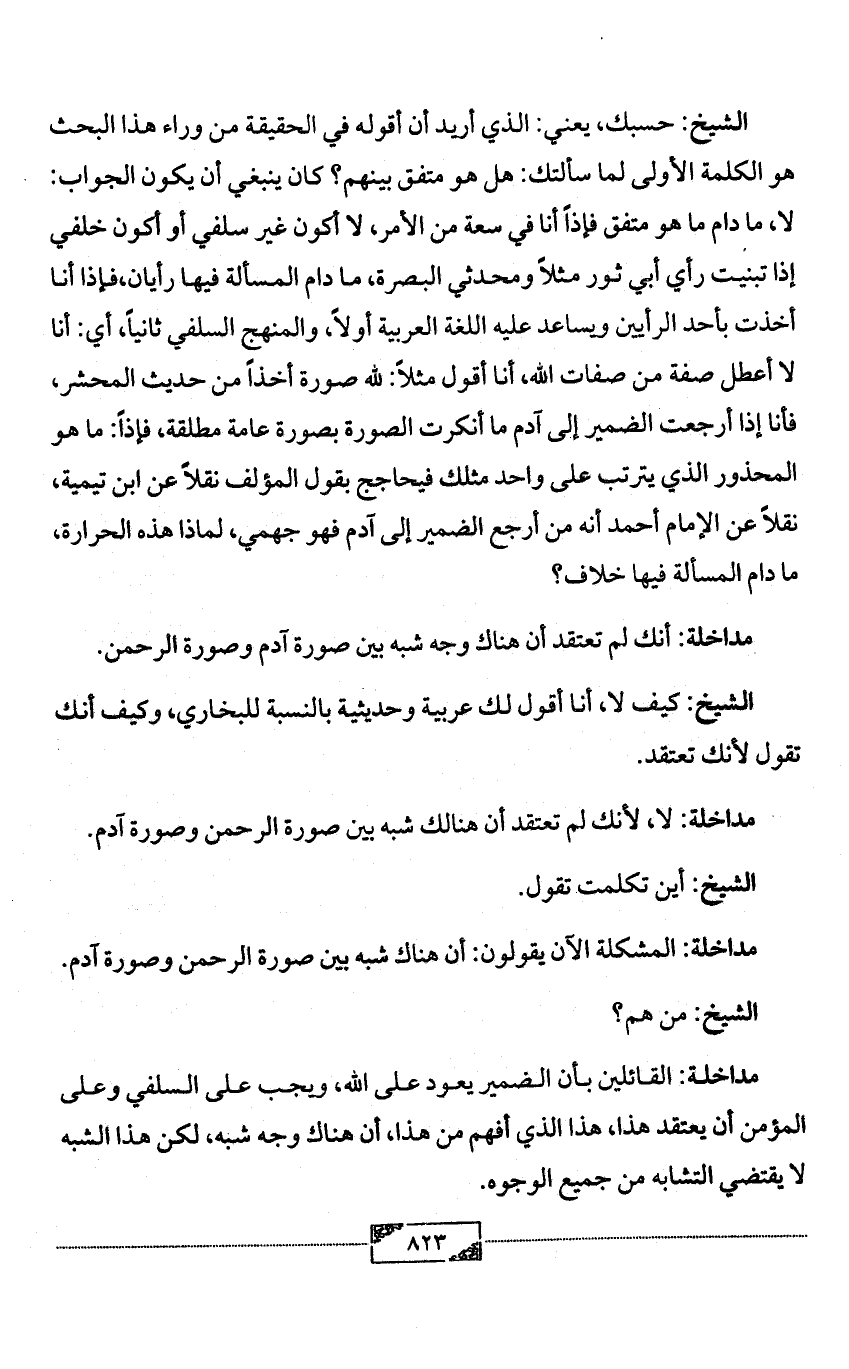 الشيخ: حسبك، يعني: الذي أريد أن أقوله في الحقيقة من وراء هذا البحث هو الكلمة الأولى لما سألتك: هل هو متفق بينهم؟ كان ينبغي أن يكون الجواب: لا، ما دام ما هو متفق فإذاً أنا في سعة من الأمر، لا أكون غير سلفي أو أكون خلفي إذا تبنيت رأي أبي ثور مثلاً ومحدثي البصرة، ما دام المسألة فيها رأيان، فإذا أنا أخذت بأحد الرأيين ويساعد عليه اللغة العربية أولاً، والمنهج السلفي ثانياً، أي: أنا لا أعطل صفة من صفات الله، أنا أقول مثلاً: لله صورة أخذاً من حديث المحشر، فأنا إذا أرجعت الضمير إلى آدم ما أنكرت الصورة بصورة عامة مطلقة، فإذاً: ما هو المحذور الذي يترتب على واحد مثلك فيحاجج بقول المؤلف نقلاًً عن ابن تيمية، نقلاً عن الإمام أحمد أنه من أرجع الضمير إلى آدم فهو جهمي، لماذا هذه الحرارة، ما دام المسألة فيها خلاف؟