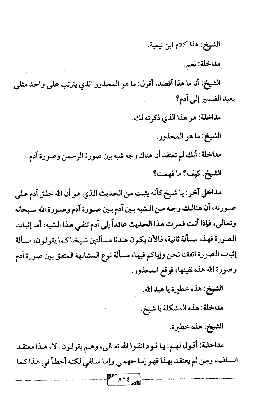 مداخل آخر: يا شيخ كأنه يثبت من الحديث الذي هو أن الله خلق آدم على صورته، أن هنالك وجه من الشبه بين آدم بين صورة آدم وصورة الله سبحانه وتعالى، فإذا أنت فسرت هذا الحديث عائداً إلى آدم تنفي هذا الشبه، أما إثبات الصورة فهذه مسألة ثانية، فالآن يكون عندنا مسألتين شيخنا كما يقولون، مسألة إثبات الصورة اتفقنا نحن وإياكم فيها، مسألة نوع المشابهة المتفق بين صورة آدم وصورة الله هذه نفيتها، فوقع المحذور.