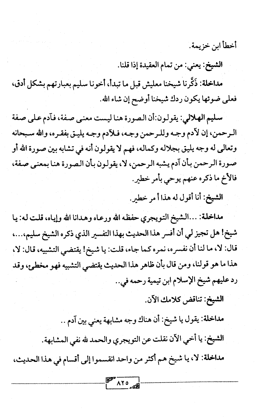 سليم الهلالي: يقولون: أن الصورة هنا ليست معنى صفة، فآدم على صفة الرحمن، إن لآدم وجه وللرحمن وجه، فلآدم وجه يليق بفقره، والله سبحانه وتعالى له وجه يليق بجلاله وكماله، فهم لا يقولون أنه في تشابه بين صورة الله أو صورة الرحمن بأن آدم يشبه الرحمن، لا، يقولون بأن الصورة هنا بمعنى صفة، فالأخ ما ذكره عنهم يوحي بأمر خطير.