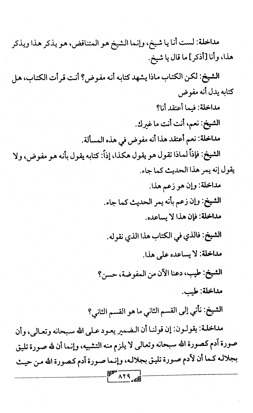 الشيخ: فإذاً لماذا تقول هو يقول هكذا، إذاً: كتابه يقول بأنه هو مفوض، ولا يقول إنه يمر هذا الحديث كما جاء.