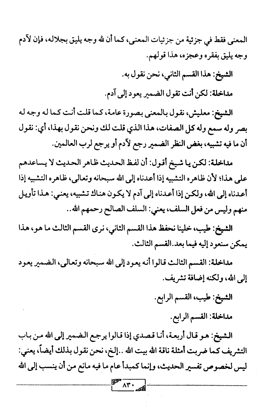 الشيخ: معليش، نقول بالمعنى بصورة عامة، كما قلت أنت كما له وجه له بصر وله سمع وله كل الصفات، هذا الذي قلت لك ونحن نقول بهذا، أي: نقول أن ما فيه تشبيه، بغض النظر الضمير رجع لآدم أو يرجع لرب العالمين.