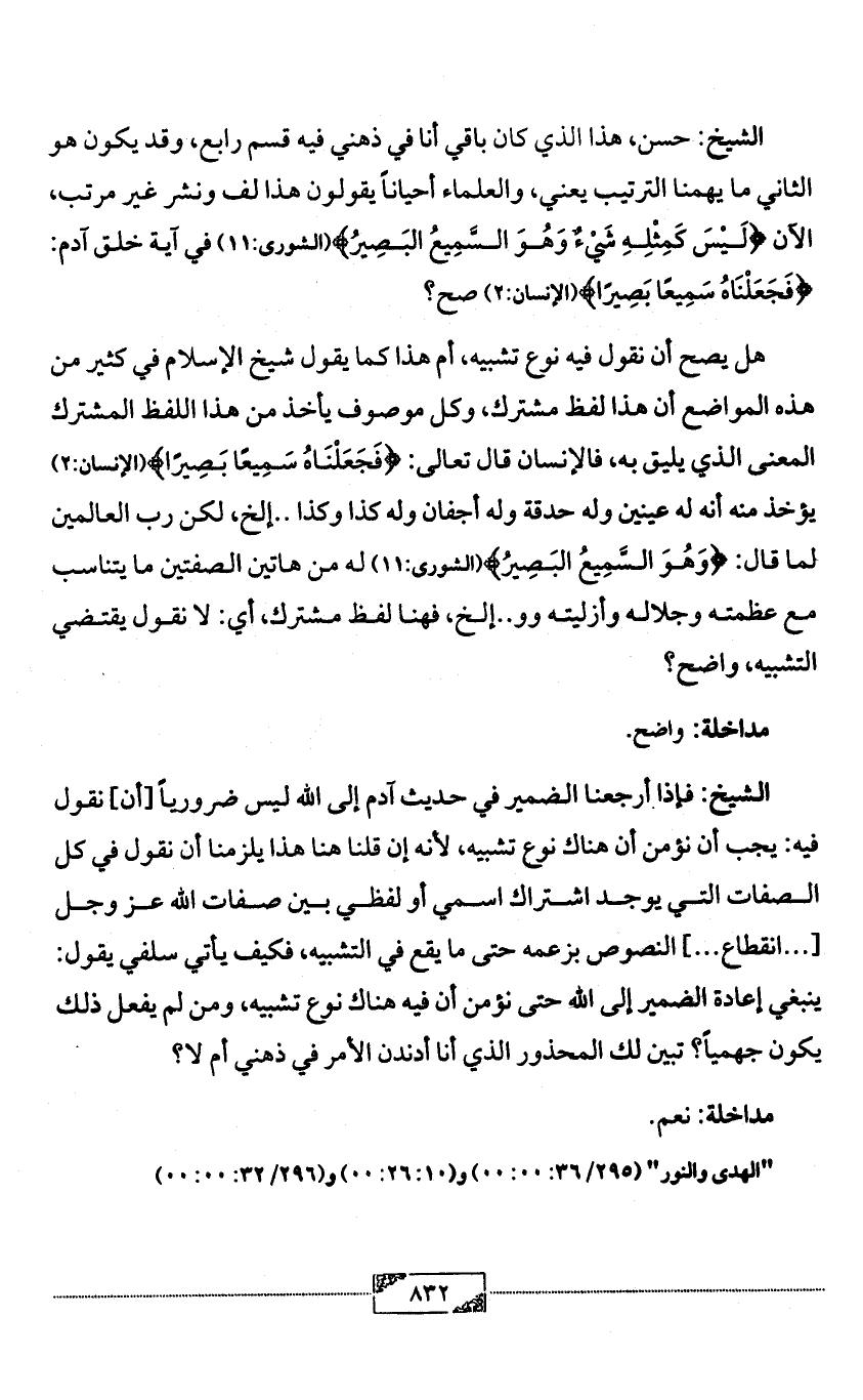الشيخ: حسن، هذا الذي كان باقي أنا في ذهني فيه قسم رابع، وقد يكون هو الثاني ما يهمنا الترتيب يعني، والعلماء أحياناً يقولون هذا لف ونشر غير مرتب، الآن {لَيْسَ كَمِثْلِهِ شَيْءٌ وَهُوَ السَّمِيعُ البَصِيرُ} (الشورى:11) في آية خلق آدم: {فَجَعَلْنَاهُ سَمِيعًا بَصِيرًا} (الإنسان:2) صح؟