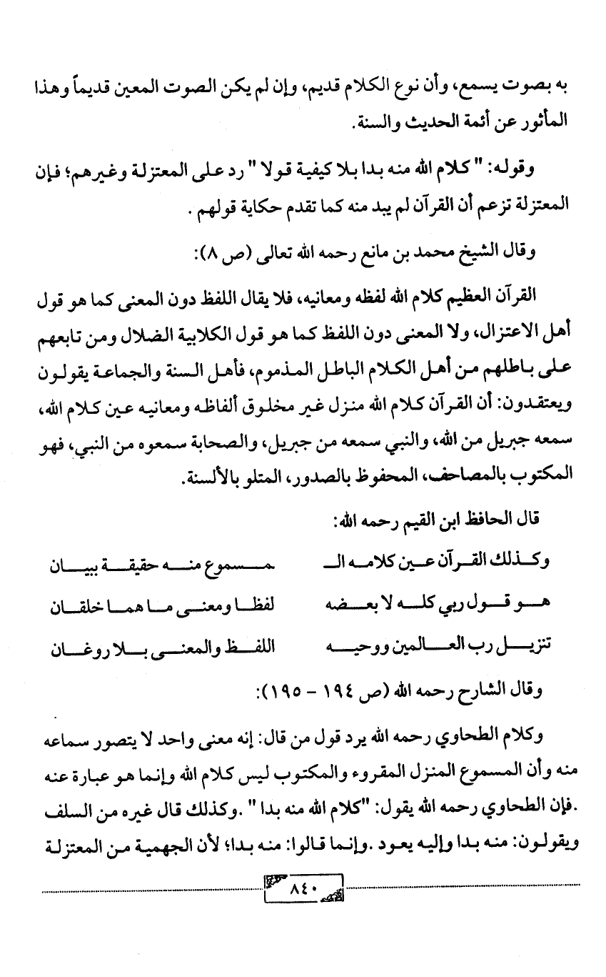 وقوله: " كلام الله منه بدا بلا كيفية قولا " رد على المعتزلة وغيرهم؛ فإن المعتزلة تزعم أن القرآن لم يبد منه كما تقدم حكاية قولهم.