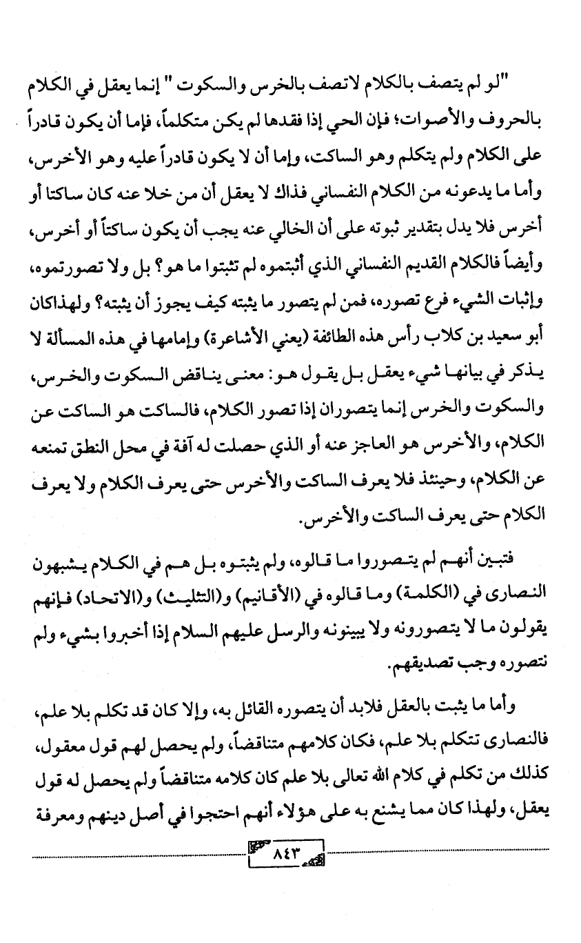 "لو لم يتصف بالكلام لاتصف بالخرس والسكوت " إنما يعقل في الكلام بالحروف والأصوات؛ فإن الحي إذا فقدها لم يكن متكلماً, فإما أن يكون قادراً على الكلام ولم يتكلم وهو الساكت, وإما أن لا يكون قادراً عليه وهو الأخرس, وأما ما يدعونه من الكلام النفساني فذاك لا يعقل أن من خلا عنه كان ساكتا أو أخرس فلا يدل بتقدير ثبوته على أن الخالي عنه يجب أن يكون ساكتاً أو أخرس, وأيضاً فالكلام القديم النفساني الذي أثبتموه لم تثبتوا ما هو؟ بل ولا تصورتموه, وإثبات الشيء فرع تصوره, فمن لم يتصور ما يثبته كيف يجوز أن يثبته؟ ولهذاكان أبو سعيد بن كلاب رأس هذه الطائفة (يعني الأشاعرة) وإمامها في هذه المسألة لا يذكر في بيانها شيء يعقل بل يقول هو: معنى يناقض السكوت والخرس, والسكوت والخرس إنما يتصوران إذا تصور الكلام, فالساكت هو الساكت عن الكلام, والأخرس هو العاجز عنه أو الذي حصلت له آفة في محل النطق تمنعه عن الكلام, وحينئذ فلا يعرف الساكت والأخرس حتى يعرف الكلام ولا يعرف الكلام حتى يعرف الساكت والأخرس.