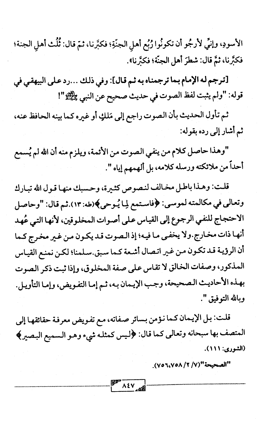 أن الرؤية قد تكون من غير اتصال أشعة كما سبق. سلمنا؛ لكن نمنع القياس المذكور، وصفات الخالق لا تقاس على صفة المخلوق، وإذا ثبت ذكر الصوت بهذه الأحاديث الصحيحة، وجب الإيمان به، ثم إما التفويض، وإما التأويل.