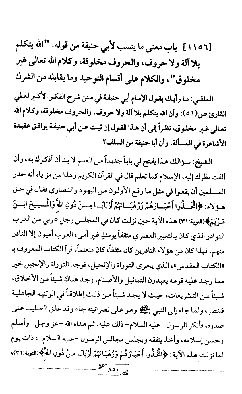 [1156] باب معنى ما ينسب لأبي حنيفة من قوله: "الله يتكلم بلا آلة ولا حروف، والحروف مخلوقة، وكلام الله تعالى غير مخلوق"، والكلام على أقسام التوحيد وما يقابله من الشرك