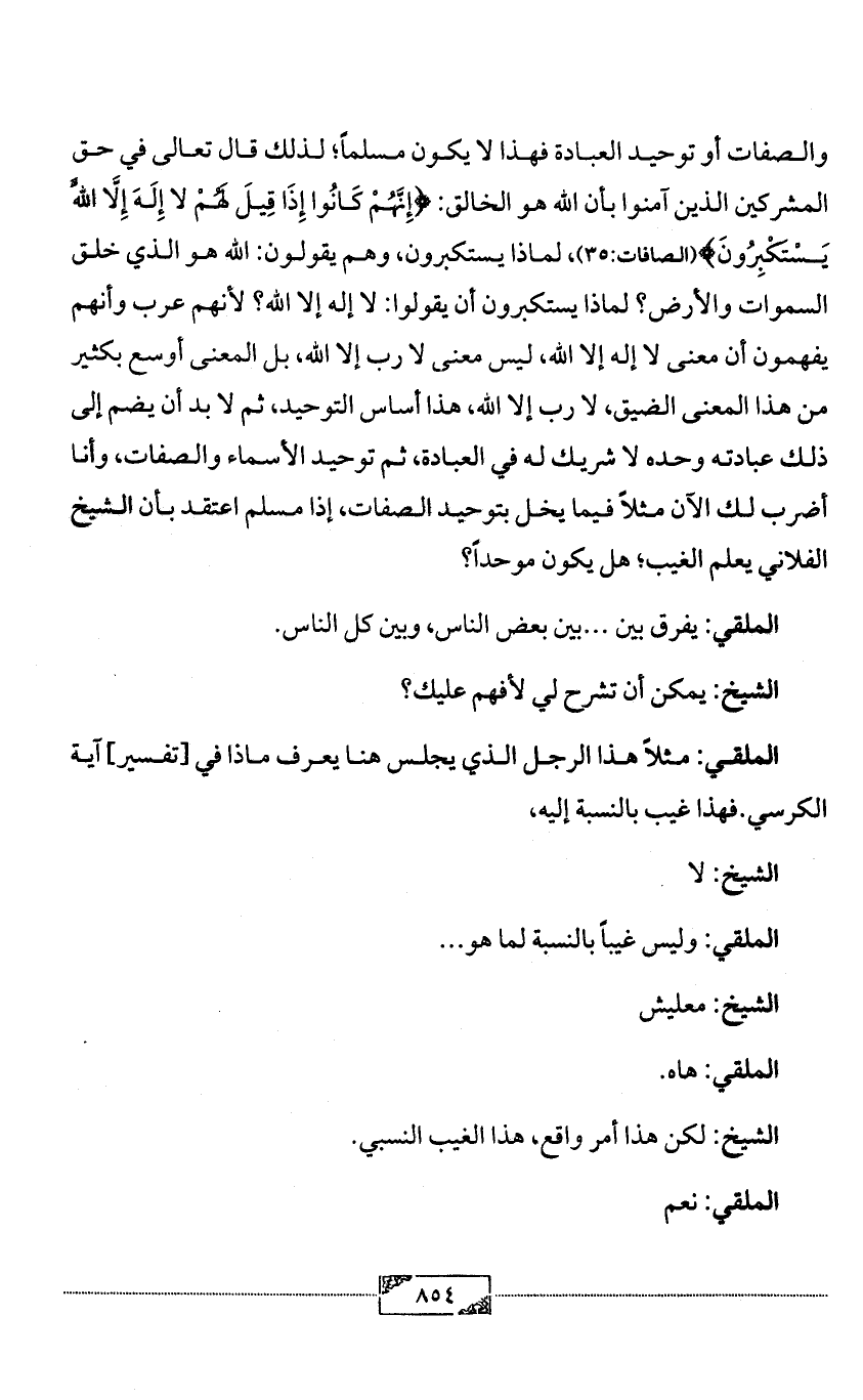 والصفات أو توحيد العبادة فهذا لا يكون مسلماً؛ لذلك قال تعالى في حق المشركين الذين آمنوا بأن الله هو الخالق: {إِنَّهُمْ كَانُوا إِذَا قِيلَ لَهُمْ لا إِلَهَ إِلَّا اللَّهُ يَسْتَكْبِرُونَ} (الصافات:35)، لماذا يستكبرون، وهم يقولون: الله هو الذي خلق السموات والأرض؟ لماذا يستكبرون أن يقولوا: لا إله إلا الله؟ لأنهم عرب وأنهم يفهمون أن معنى لا إله إلا الله، ليس معنى لا رب إلا الله، بل المعنى أوسع بكثير من هذا المعنى الضيق، لا رب إلا الله، هذا أساس التوحيد، ثم لا بد أن يضم إلى ذلك عبادته وحده لا شريك له في العبادة، ثم توحيد الأسماء والصفات، وأنا أضرب لك الآن مثلاً فيما يخل بتوحيد الصفات، إذا مسلم اعتقد بأن الشيخ الفلاني يعلم الغيب؛ هل يكون موحداً؟