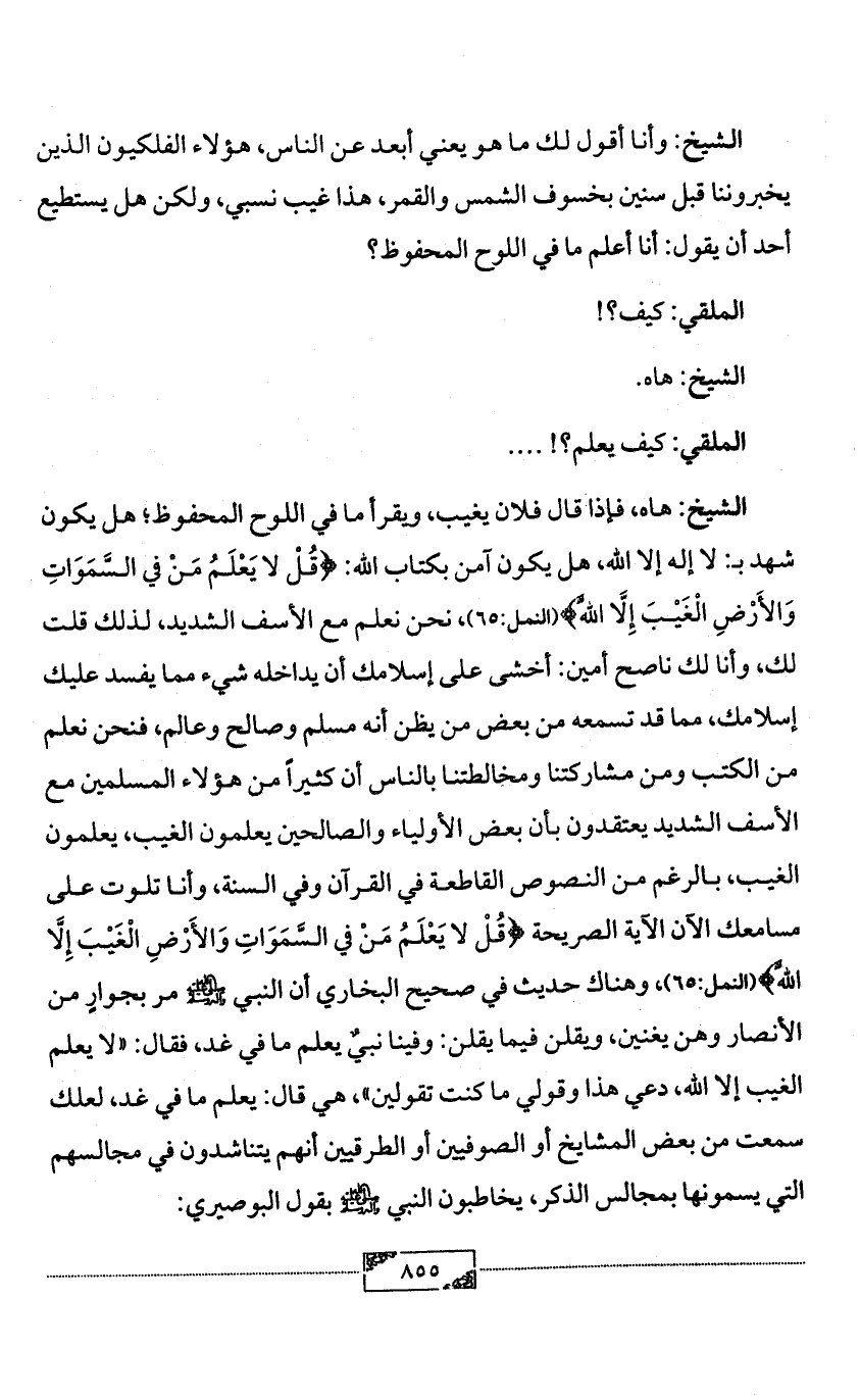 الشيخ: هاه، فإذا قال فلان يغيب، ويقرأ ما في اللوح المحفوظ؛ هل يكون شهد بـ: لا إله إلا الله، هل يكون آمن بكتاب الله: {قُلْ لا يَعْلَمُ مَنْ في السَّمَوَاتِ وَالأَرْضِ الْغَيْبَ إِلَّا اللَّهُ} (النمل:65)، نحن نعلم مع الأسف الشديد، لذلك قلت لك، وأنا لك ناصح أمين: أخشى على إسلامك أن يداخله شيء مما يفسد عليك إسلامك، مما قد تسمعه من بعض من يظن أنه مسلم وصالح وعالم، فنحن نعلم من الكتب ومن مشاركتنا ومخالطتنا بالناس أن كثيراً من هؤلاء المسلمين مع الأسف الشديد يعتقدون بأن بعض الأولياء والصالحين يعلمون الغيب، يعلمون الغيب، بالرغم من النصوص القاطعة في القرآن وفي السنة، وأنا تلوت على مسامعك الآن الآية الصريحة {قُلْ لا يَعْلَمُ مَنْ في السَّمَوَاتِ وَالأَرْضِ الْغَيْبَ إِلَّا اللَّهُ} (النمل:65)، وهناك حديث في صحيح البخاري أن النبي - صلى الله عليه وآله وسلم - مر بجوارٍ من الأنصار وهن يغنين، ويقلن فيما يقلن: وفينا نبيٌ يعلم ما في غد، فقال: «لا يعلم الغيب إلا الله، دعي هذا وقولي ما كنت تقولين»، هي قال: يعلم ما في غد، لعلك سمعت من بعض المشايخ أو الصوفيين أو الطرقيين أنهم يتناشدون في مجالسهم التي يسمونها بمجالس الذكر، يخاطبون النبي - صلى الله عليه وآله وسلم - بقول البوصيري: