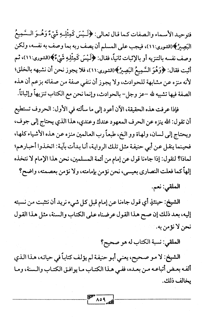 الشيخ: لا مو صحيح، يعني أبو حنيفة لم يؤلف كتاباً في حياته، هذا الذي ألفه بعض أتباعه من بعده، ففي هذا الكتاب ما يوافق الكتاب والسنة، وما يخالف ذلك.