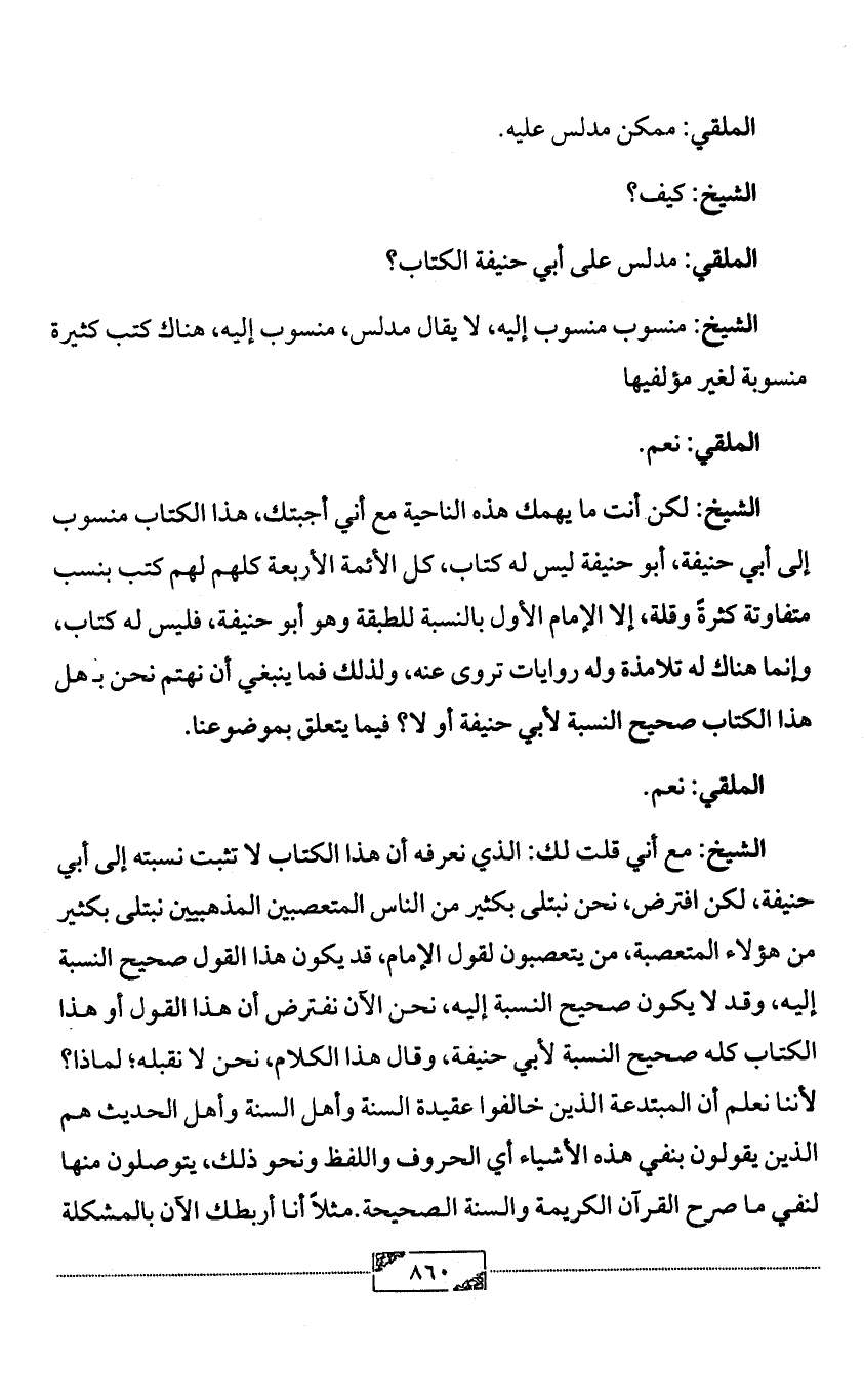 الشيخ: مع أني قلت لك: الذي نعرفه أن هذا الكتاب لا تثبت نسبته إلى أبي حنيفة، لكن افترض، نحن نبتلى بكثير من الناس المتعصبين المذهبيين نبتلى بكثير من هؤلاء المتعصبة، من يتعصبون لقول الإمام، قد يكون هذا القول صحيح النسبة إليه، وقد لا يكون صحيح النسبة إليه، نحن الآن نفترض أن هذا القول أو هذا الكتاب كله صحيح النسبة لأبي حنيفة، وقال هذا الكلام، نحن لا نقبله؛ لماذا؟ لأننا نعلم أن المبتدعة الذين خالفوا عقيدة السنة وأهل السنة وأهل الحديث هم الذين يقولون بنفي هذه الأشياء أي الحروف واللفظ ونحو ذلك، يتوصلون منها لنفي ما صرح القرآن الكريمة والسنة الصحيحة. مثلاً أنا أربطك الآن بالمشكلة