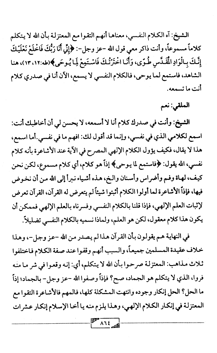 الشيخ: آه الكلام النفسي، معناها أنهم التقوا مع المعتزلة بأن الله لا يتكلم كلاماً مسموعاً، وأنت ذاكر معي قول الله -عز وجل-: {إِنِّي أَنَا رَبُّكَ فَاخْلَعْ نَعْلَيْكَ إِنَّكَ بِالْوَادِ الْمُقَدَّسِ طُوًى، وَأَنَا اخْتَرْتُكَ فَاسْتَمِعْ لِمَا يُوحَى} (طه:12، 13)، هنا الشاهد، فاستمع لما يوحى، فالكلام النفسي لا يسمع، الآن أنا في صدري كلام أنت ما تسمعه.