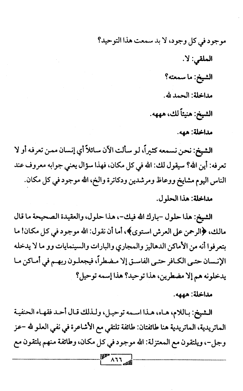 الشيخ: باللام، هاه، هذا اسمه توحيل، ولذلك قال أحد فقهاء الحنفية الماتريدية، الماتريدية هنا طائفتان: طائفة تلتقي مع الأشاعرة في نفي العلو لله -عز وجل-، ويلتقون مع المعتزلة: الله موجود في كل مكان، وطائفة منهم يلتقون مع