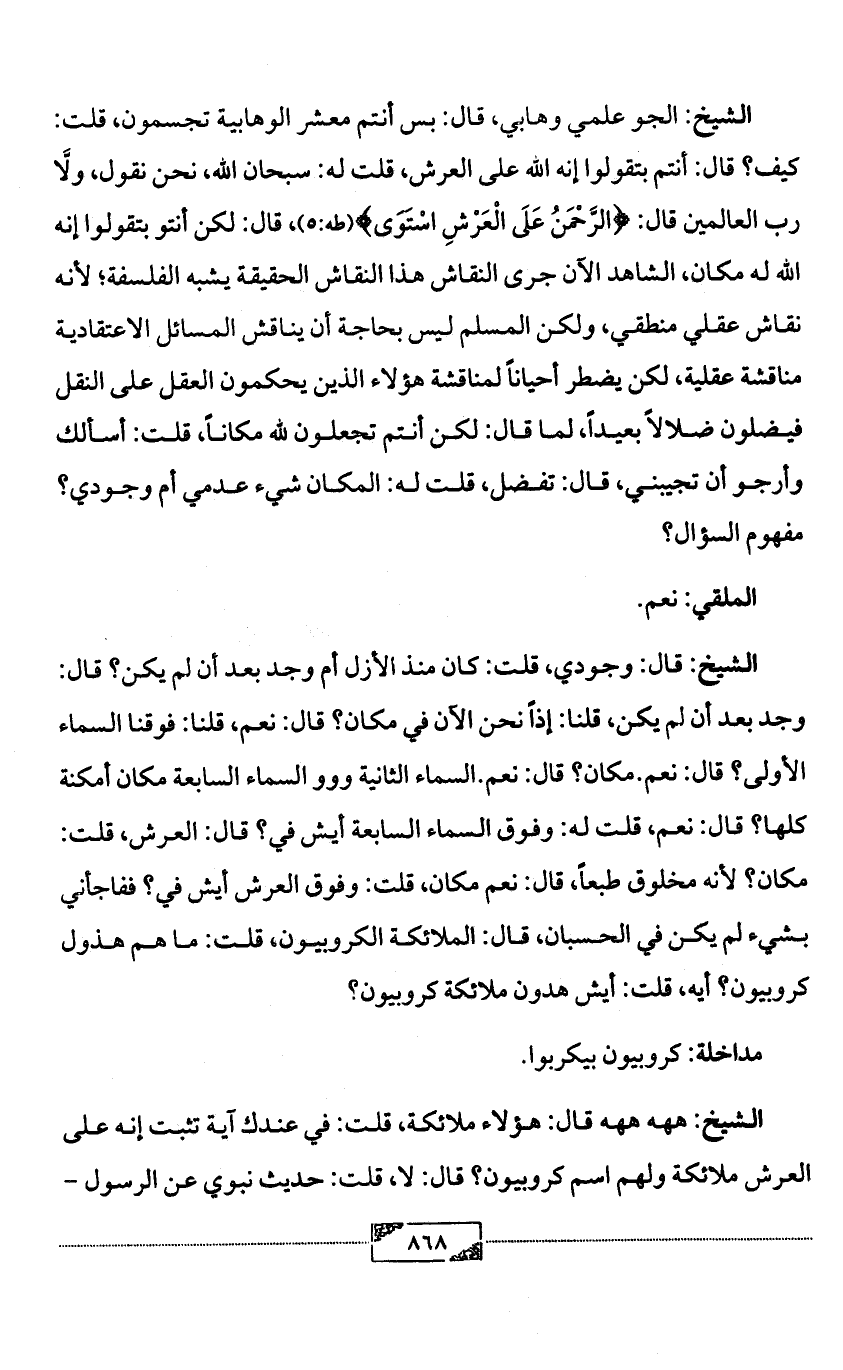 الشيخ: الجو علمي وهابي، قال: بس أنتم معشر الوهابية تجسمون، قلت: كيف؟ قال: أنتم بتقولوا إنه الله على العرش، قلت له: سبحان الله، نحن نقول، ولَّا رب العالمين قال: {الرَّحْمَنُ عَلَى الْعَرْشِ اسْتَوَى} (طه:5)، قال: لكن أنتو بتقولوا إنه الله له مكان، الشاهد الآن جرى النقاش هذا النقاش الحقيقة يشبه الفلسفة؛ لأنه نقاش عقلي منطقي، ولكن المسلم ليس بحاجة أن يناقش المسائل الاعتقادية مناقشة عقلية، لكن يضطر أحياناً لمناقشة هؤلاء الذين يحكمون العقل على النقل فيضلون ضلالاً بعيداً، لما قال: لكن أنتم تجعلون لله مكاناً، قلت: أسألك