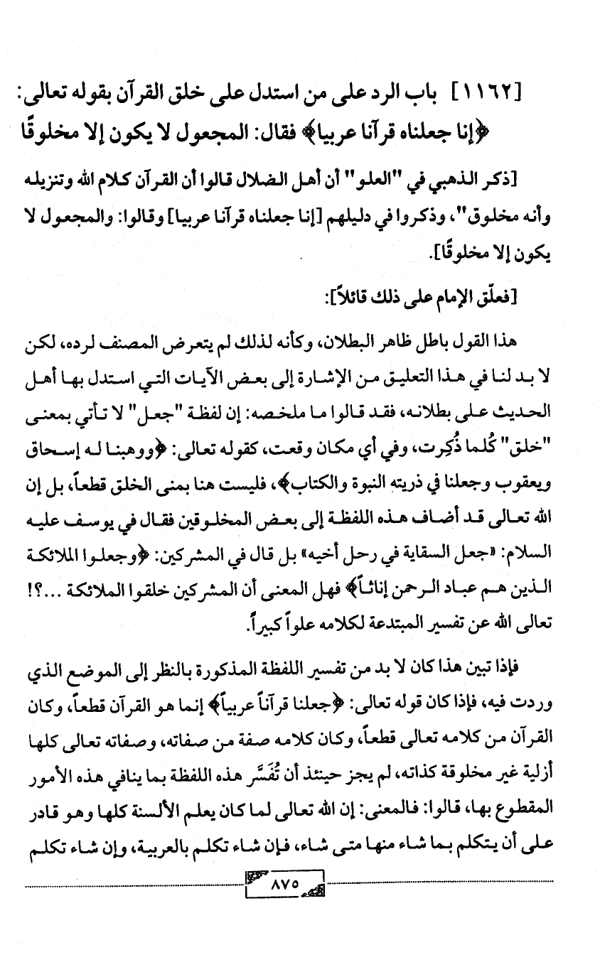 [1162] باب الرد على من استدل على خلق القرآن بقوله تعالى: {إنا جعلناه قرآنا عربيا} فقال: المجعول لا يكون إلا مخلوقًا