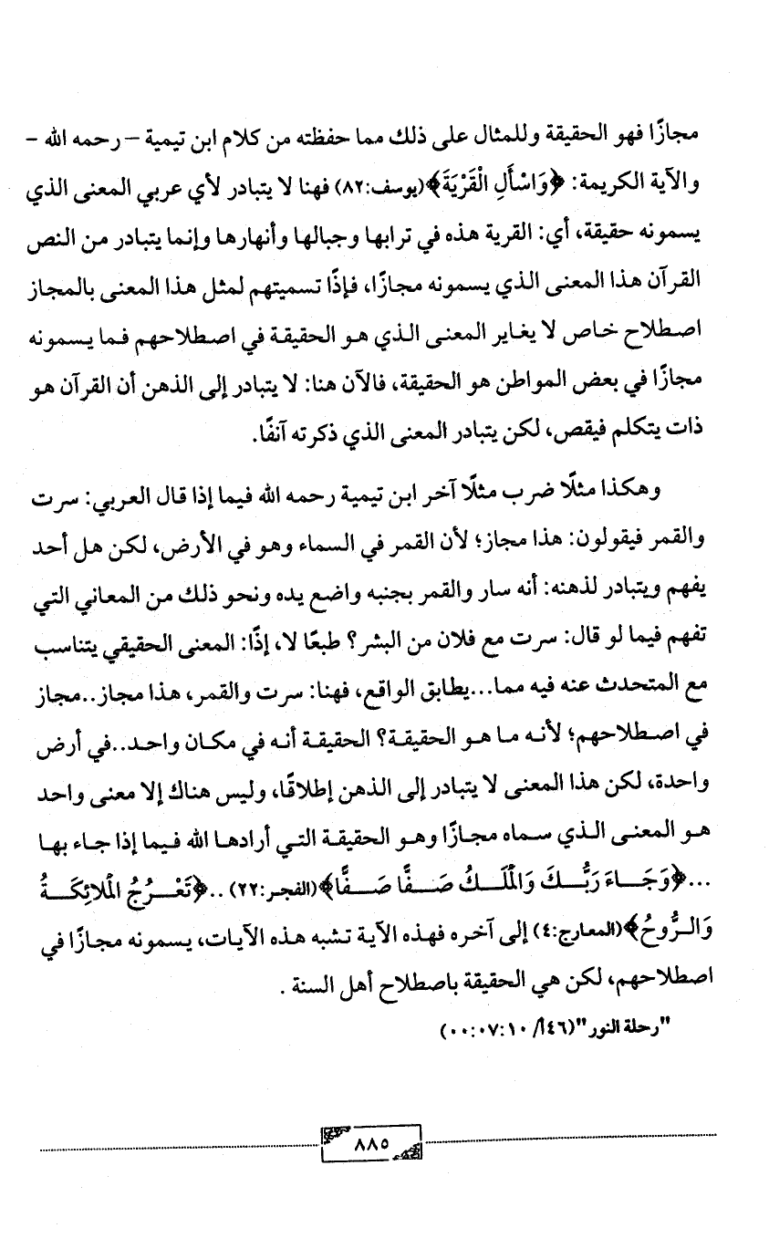 وهكذا مثلًا ضرب مثلًا آخر ابن تيمية رحمه الله فيما إذا قال العربي: سرت والقمر فيقولون: هذا مجاز؛ لأن القمر في السماء وهو في الأرض، لكن هل أحد يفهم ويتبادر لذهنه: أنه سار والقمر بجنبه واضع يده ونحو ذلك من المعاني التي تفهم فيما لو قال: سرت مع فلان من البشر؟ طبعًا لا، إذًا: المعنى الحقيقي يتناسب مع المتحدث عنه فيه مما ... يطابق الواقع، فهنا: سرت والقمر، هذا مجاز .. مجاز في اصطلاحهم؛ لأنه ما هو الحقيقة؟ الحقيقة أنه في مكان واحد .. في أرض واحدة، لكن هذا المعنى لا يتبادر إلى الذهن إطلاقًا، وليس هناك إلا معنى واحد هو المعنى الذي سماه مجازًا وهو الحقيقة التي أرادها الله فيما إذا جاء بها ... {وَجَاءَ رَبُّكَ وَالْمَلَكُ صَفًّا صَفًّا} (الفجر:22) .. {تَعْرُجُ الْمَلائِكَةُ وَالرُّوحُ} (المعارج:4) إلى آخره فهذه الآية تشبه هذه الآيات، يسمونه مجازًا في اصطلاحهم، لكن هي الحقيقة باصطلاح أهل السنة.