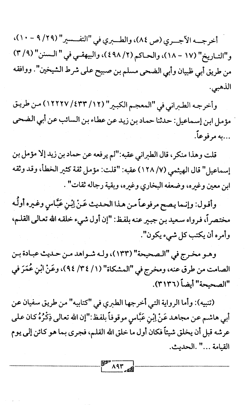 وأقول: وإنما يصح مرفوعاً من هذا الحديث عَنْ اِبْنِ عَبَّاسٍ وغيره أولُه مختصراً، فرواه سعيد بن جبير عنه بلفظ: "إن أول شيء خلقه الله تعالى القلم، وأمره أن يكتب كل شيء يكون".