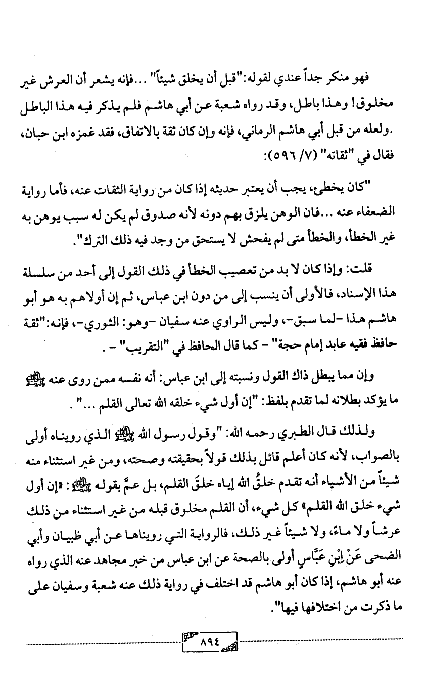 ولذلك قال الطبري رحمه الله: "وقول رسول الله - صلى الله عليه وآله وسلم - الذي رويناه أولى بالصواب، لأنه كان أعلم قائل بذلك قولاً بحقيقته وصحته، ومن غير استثناء منه شيئاً من الأشياء أنه تقدم خلقُ الله إياه خلقَ القلم، بل عمَّ بقوله - صلى الله عليه وآله وسلم -: «إن أول شيء خلق الله القلم» كل شيء، أن القلم مخلوق قبله من غير استثناء من ذلك عرشاً ولا ماءً، ولا شيئاً غير ذلك، فالرواية التي رويناها عن أبي ظبيان وأبي الضحى عَنْ اِبْنِ عَبَّاسٍ أولى بالصحة عن ابن عباس من خبر مجاهد عنه الذي رواه عنه أبو هاشم، إذا كان أبو هاشم قد اختلف في رواية ذلك عنه شعبة وسفيان على ما ذكرت من اختلافها فيها".