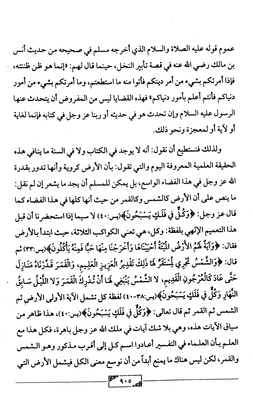ولذلك فنستطيع أن نقول: أنه لا يوجد في الكتاب ولا في السنة ما ينافي هذه الحقيقة العلمية المعروفة اليوم والتي تقول: بأن الأرض كروية وأنها تدور بقدرة الله عز وجل في هذا الفضاء الواسع، بل يمكن للمسلم أن يجد ما يشعر إن لم نقل: ما ينص على أن الأرض كالشمس وكالقمر من حيث أنها كلها في هذا الفضاء كما قال عز وجل: {وَكُلٌّ في فَلَكٍ يَسْبَحُونَ} (يس:40) لا سيما إذا استحضرنا أن قبل هذا التعميم الإلهي بلفظة: وكل، هي تعني الكواكب الثلاثة، حيث ابتدأ بالأرض فقال: {وَآيَةٌ لَهُمُ الأَرْضُ الْمَيْتَةُ أَحْيَيْنَاهَا وَأَخْرَجْنَا مِنْهَا حَبًّا فَمِنْهُ يَأْكُلُونَ} (يس:33) ثم قال: {وَالشَّمْسُ تَجْرِي لِمُسْتَقَرٍّ لَهَا ذَلِكَ تَقْدِيرُ الْعَزِيزِ الْعَلِيمِ، وَالْقَمَرَ قَدَّرْنَاهُ مَنَازِلَ حَتَّى عَادَ كَالْعُرْجُونِ الْقَدِيمِ، لا الشَّمْسُ يَنْبَغِي لَهَا أَنْ تُدْرِكَ الْقَمَرَ وَلا اللَّيْلُ سَابِقُ النَّهَارِ وَكُلٌّ في فَلَكٍ يَسْبَحُونَ} (يس:38 - 40) لفظة كل تشمل الآية الأولى الأرض ثم الشمس ثم القمر ثم قال تعالى: {وَكُلٌّ في فَلَكٍ يَسْبَحُونَ} (يس:40)، هذا ظاهر من سياق الآيات هذه، وهي بلا شك آيات في ملك الله عز وجل باهرة، فكل هذا مع العلم بأن العلماء في التفسير أعادوا اسم كل إلى أقرب مذكور وهو الشمس والقمر، لكن ليس هناك ما يمنع أبداً من أن نوسع معنى الكل فيشمل الأرض التي