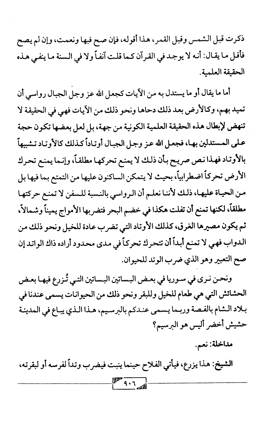 أما ما يقال أو ما يستدل به من الآيات كجعل الله عز وجل الجبال رواسي أن تميد بهم، وكالأرض بعد ذلك دحاها ونحو ذلك من الآيات فهي في الحقيقة لا تنهض لإبطال هذه الحقيقة العلمية الكونية من جهة، بل لعل بعضها تكون حجة على المستدلين بها، فجعل الله عز وجل الجبال أوتاداً كذلك كالأوتاد تشبيهاً بالأوتاد فهذا نص صريح بأن ذلك لا يمنع تحركها مطلقاً، وإنما يمنع تحرك الأرض تحركاً اضطرابياً، بحيث لا يتمكن الساكنون عليها من التمتع بما فيها بل من الحياة عليها، ذلك لأننا نعلم أن الرواسي بالنسبة للسفن لا تمنع حركتها مطلقاً، لكنها تمنع أن تفلت هكذا في خضم البحر فتضربها الأمواج يميناً وشمالاً، ثم يكون مصيرها الغرق، كذلك الأوتاد التي تضرب عادة للخيل ونحو ذلك من الدواب فهي لا تمنع أبداً أن تتحرك تحركاً في مدى محدود أراده ذاك الواتد إن صح التعبير وهو الذي ضرب الوتد للحيوان.