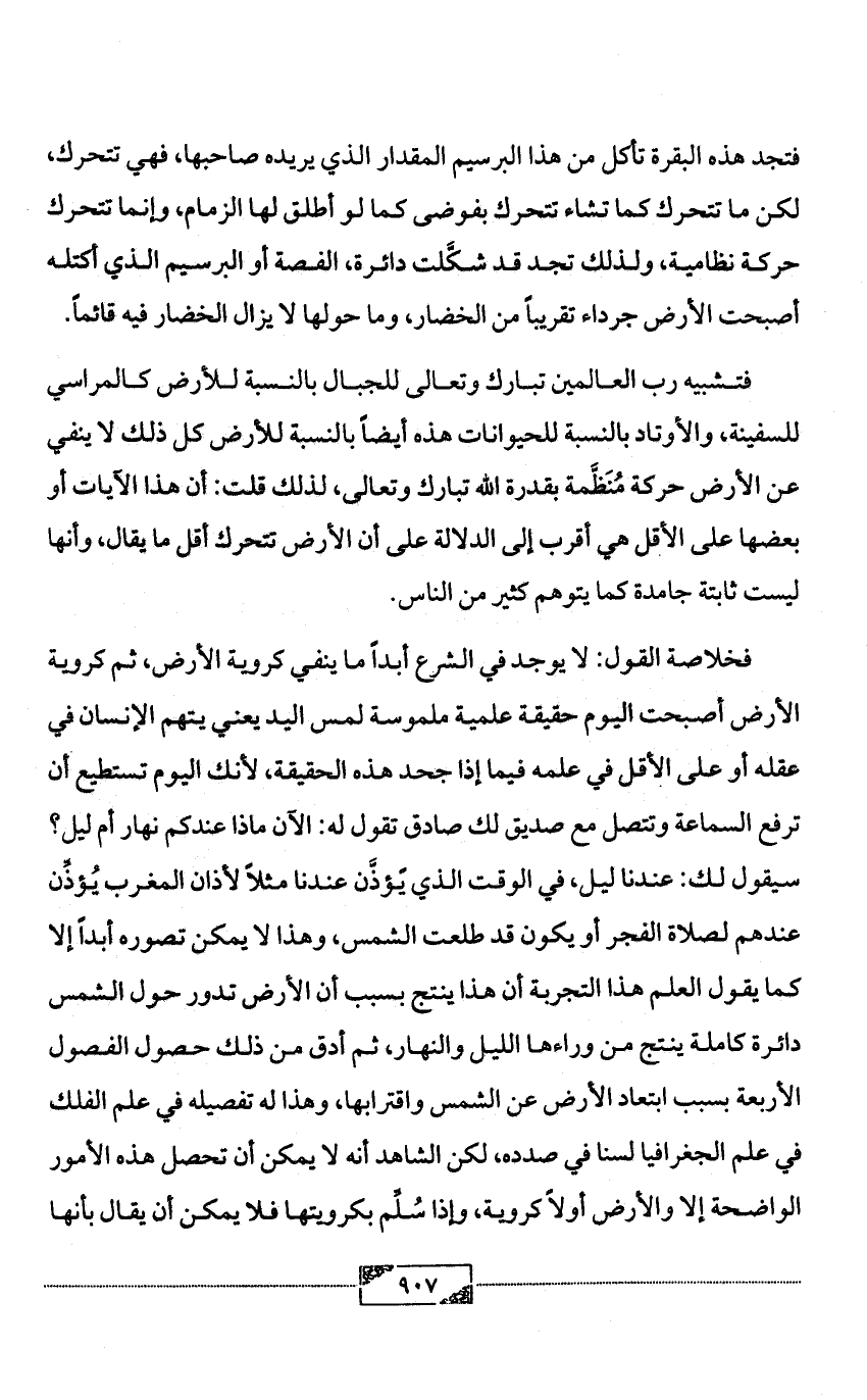 فخلاصة القول: لا يوجد في الشرع أبداً ما ينفي كروية الأرض، ثم كروية الأرض أصبحت اليوم حقيقة علمية ملموسة لمس اليد يعني يتهم الإنسان في عقله أو على الأقل في علمه فيما إذا جحد هذه الحقيقة، لأنك اليوم تستطيع أن ترفع السماعة وتتصل مع صديق لك صادق تقول له: الآن ماذا عندكم نهار أم ليل؟ سيقول لك: عندنا ليل، في الوقت الذي يًؤذَّن عندنا مثلاً لأذان المغرب يُؤذِّن عندهم لصلاة الفجر أو يكون قد طلعت الشمس، وهذا لا يمكن تصوره أبداً إلا كما يقول العلم هذا التجربة أن هذا ينتج بسبب أن الأرض تدور حول الشمس دائرة كاملة ينتج من وراءها الليل والنهار، ثم أدق من ذلك حصول الفصول الأربعة بسبب ابتعاد الأرض عن الشمس واقترابها، وهذا له تفصيله في علم الفلك في علم الجغرافيا لسنا في صدده، لكن الشاهد أنه لا يمكن أن تحصل هذه الأمور الواضحة إلا والأرض أولاً كروية، وإذا سُلِّم بكرويتها فلا يمكن أن يقال بأنها