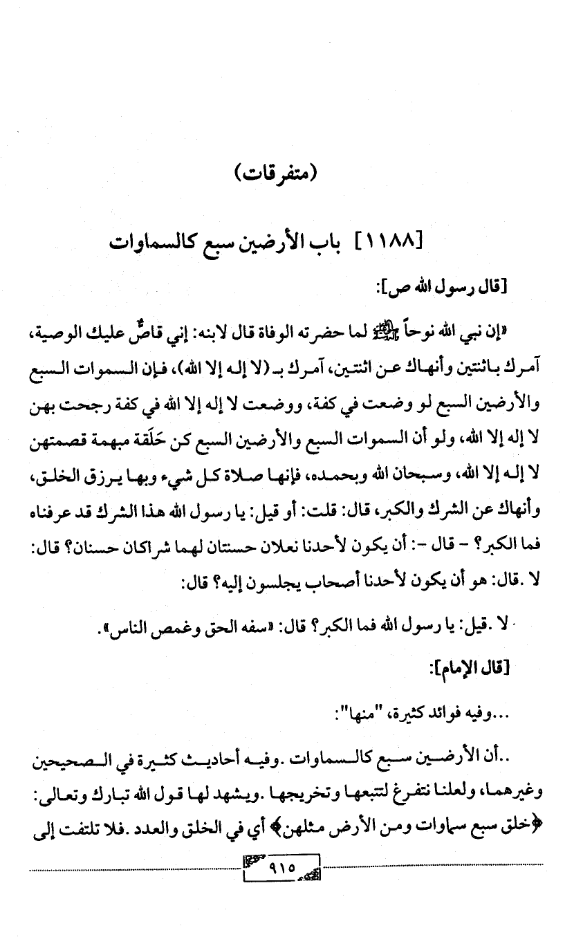 «إن نبي الله نوحاً - صلى الله عليه وآله وسلم - لما حضرته الوفاة قال لابنه: إني قاصٌّ عليك الوصية, آمرك باثنتين وأنهاك عن اثنتين, آمرك بـ (لا إله إلا الله) , فإن السموات السبع والأرضين السبع لو وضعت في كفة, ووضعت لا إله إلا الله في كفة رجحت بهن لا إله إلا الله, ولو أن السموات السبع والأرضين السبع كن حَلَقة مبهمة قصمتهن لا إله إلا الله, وسبحان الله وبحمده, فإنها صلاة كل شيء وبها يرزق الخلق, وأنهاك عن الشرك والكبر, قال: قلت: أو قيل: يا رسول الله هذا الشرك قد عرفناه فما الكبر؟ - قال -: أن يكون لأحدنا نعلان حسنتان لهما شراكان حسنان؟ قال: لا. قال: هو أن يكون لأحدنا أصحاب يجلسون إليه؟ قال: