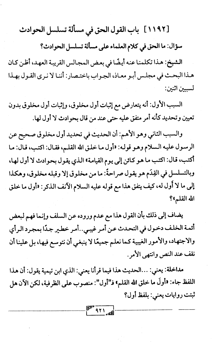 [1192] باب القول الحق في مسألة تسلسل الحوادث