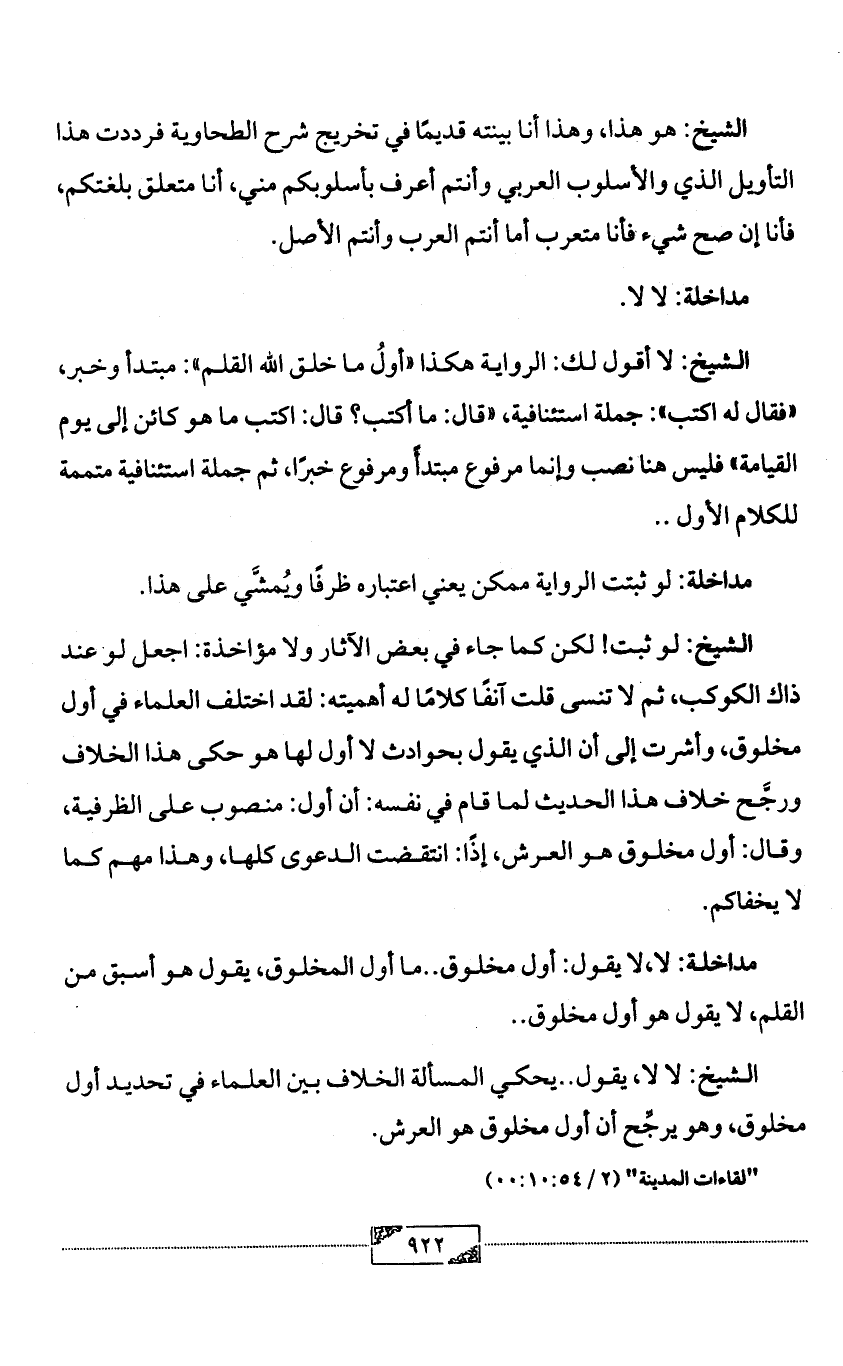 الشيخ: لا لا، يقول .. يحكي المسألة الخلاف بين العلماء في تحديد أول مخلوق، وهو يرجِّح أن أول مخلوق هو العرش.