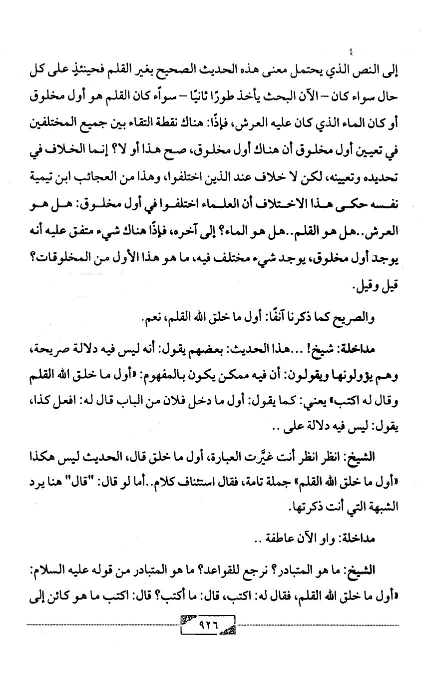 مداخلة: شيخ! ... هذا الحديث: بعضهم يقول: أنه ليس فيه دلالة صريحة، وهم يؤولونها ويقولون: أن فيه ممكن يكون بالمفهوم: «أول ما خلق الله القلم وقال له اكتب» يعني: كما يقول: أول ما دخل فلان من الباب قال له: افعل كذا، يقول: ليس فيه دلالة على ..