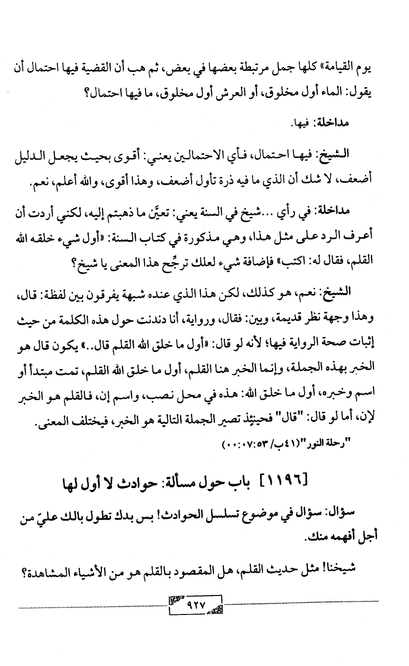 الشيخ: نعم، هو كذلك، لكن هذا الذي عنده شبهة يفرقون بين لفظة: قال، وهذا وجهة نظر قديمة، وبين: فقال، ورواية، أنا دندنت حول هذه الكلمة من حيث إثبات صحة الرواية فيها؛ لأنه لو قال: «أول ما خلق الله القلم قال .. » يكون قال هو الخبر بهذه الجملة، وإنما الخبر هنا القلم، أول ما خلق الله القلم، تمت مبتدأ أو اسم وخبره، أول ما خلق الله: هذه في محل نصب، واسم إن، فالقلم هو الخبر لإن، أما لو قال: "قال" فحينئٍذ تصير الجملة التالية هو الخبر، فيختلف المعنى.