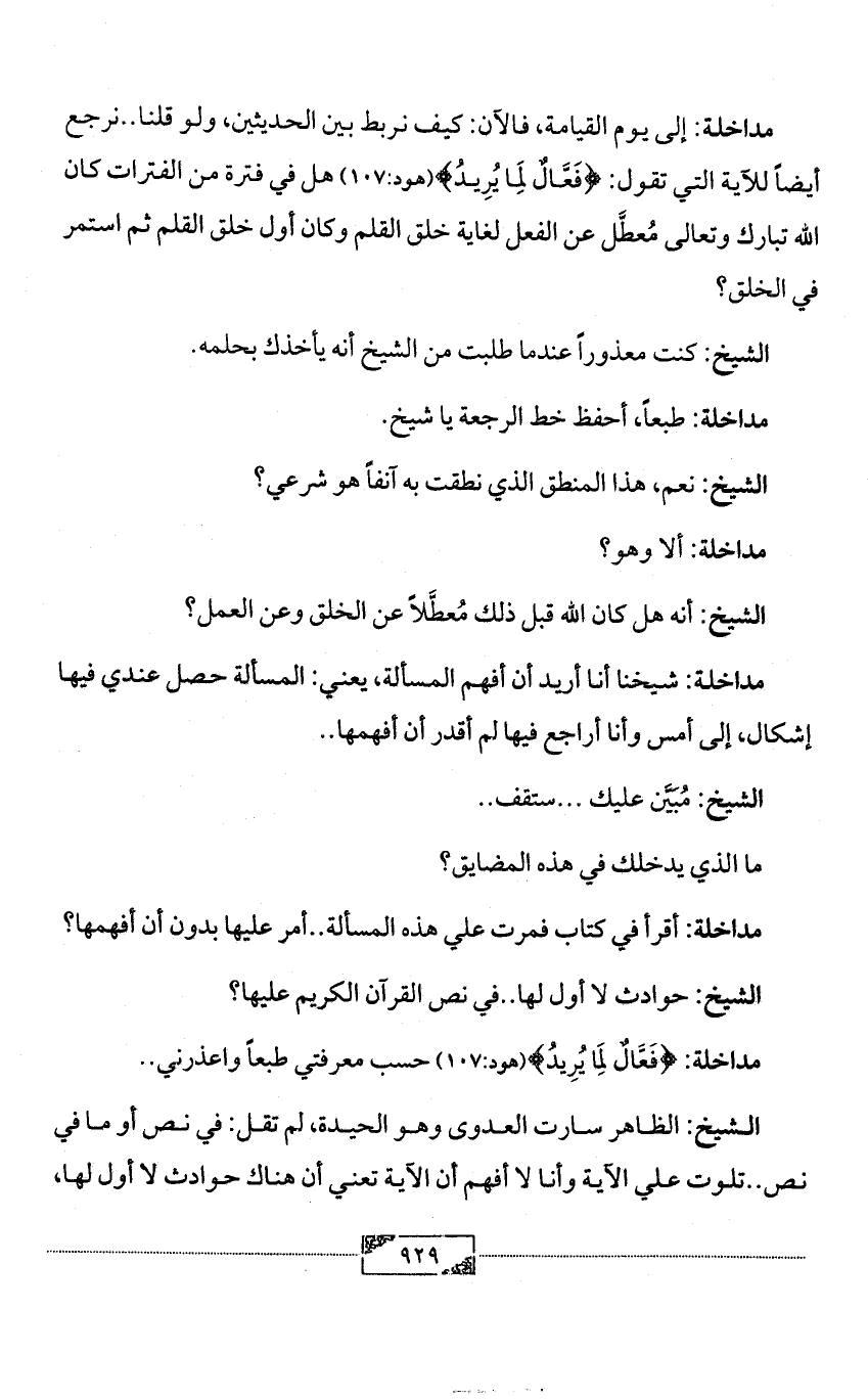 الشيخ: الظاهر سارت العدوى وهو الحيدة، لم تقل: في نص أو ما في نص .. تلوت علي الآية وأنا لا أفهم أن الآية تعني أن هناك حوادث لا أول لها،