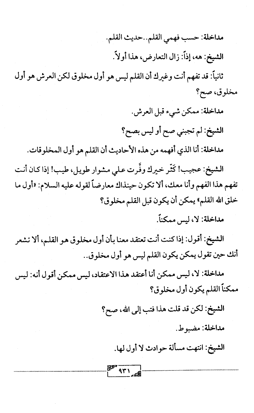 الشيخ: عجيب! كَثّر خيرك وفَّرت علي مشوار طويل، طيب! إذا كان أنت تفهم هذا الفهم وأنا معك، ألا تكون حينذاك معارضاً لقوله عليه السلام: «أول ما خلق الله القلم» يمكن أن يكون قبل القلم مخلوق؟