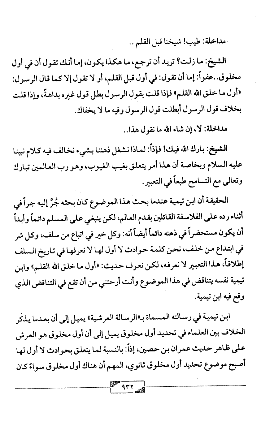 الحقيقة أن ابن تيمية عندما بحث هذا الموضوع كان بحثه جُرَّ إليه جراً في أثناء رده على الفلاسفة القائلين بقدم العالم، لكن ينبغي على المسلم دائماً وأبداً أن يكون مستحضراً في ذهنه دائماً أيضاً أنه: وكل خير في اتباع من سلف، وكل شر في ابتداع من خلف، نحن كلمة حوادث لا أول لها لا نعرفها في تاريخ السلف إطلاقاً، هذا التعبير لا نعرفه، لكن نعرف حديث: «أول ما خلق الله القلم» وابن تيمية نفسه يتناقض في هذا الموضوع وأنت أرحتني من أن تقع في التناقض الذي وقع فيه ابن تيمية.