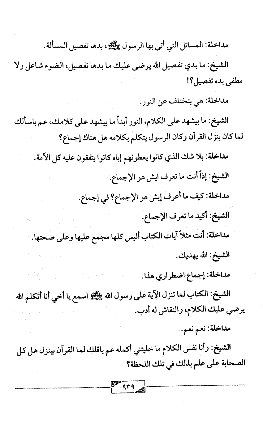 الشيخ: ما بيشهد على الكلام، النور أبداً ما بيشهد على كلامك، عم باسألك لما كان ينزل القرآن وكان الرسول يتكلم بكلامه هل هناك إجماع؟