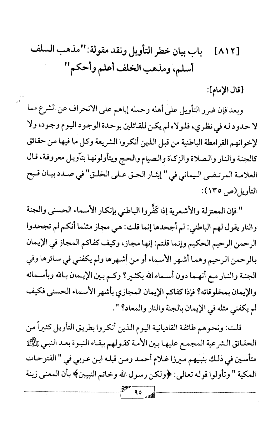 [812] باب بيان خطر التأويل ونقد مقولة:"مذهب السلف أسلم، ومذهب الخلف أعلم وأحكم"