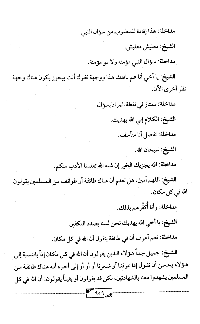 الشيخ: جميل جداً هؤلاء الذين يقولون أن الله في كل مكان إذاً بالنسبة إلى هؤلاء يحسن أن نقول إذا عرفنا أو شعرنا أو أو أو إلى أخره أنه هناك طائفة من المسلمين يشهدوا معنا بالشهادتين، لكن قد يقولون أو يقيناً يقولون: أن الله في كل