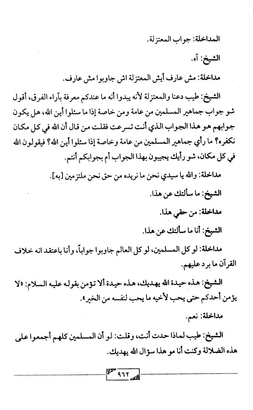الشيخ: طيب دعنا والمعتزلة لأنه يبدوا أنه ما عندكم معرفة بآراء الفرق، أقول شو جواب جماهير المسلمين من عامة ومن خاصة إذا ما سئلوا أين الله، هل يكون جوابهم هو هذا الجواب الذي أنت تسرعت فقلت من قال أن الله في كل مكان نكفره؟ ما رأي جماهير المسلمين من عامة وخاصة إذا سئلوا أين الله؟ فيقولون الله في كل مكان، شو رأيك يجيبون بهذا الجواب أم بجوابكم أنتم.