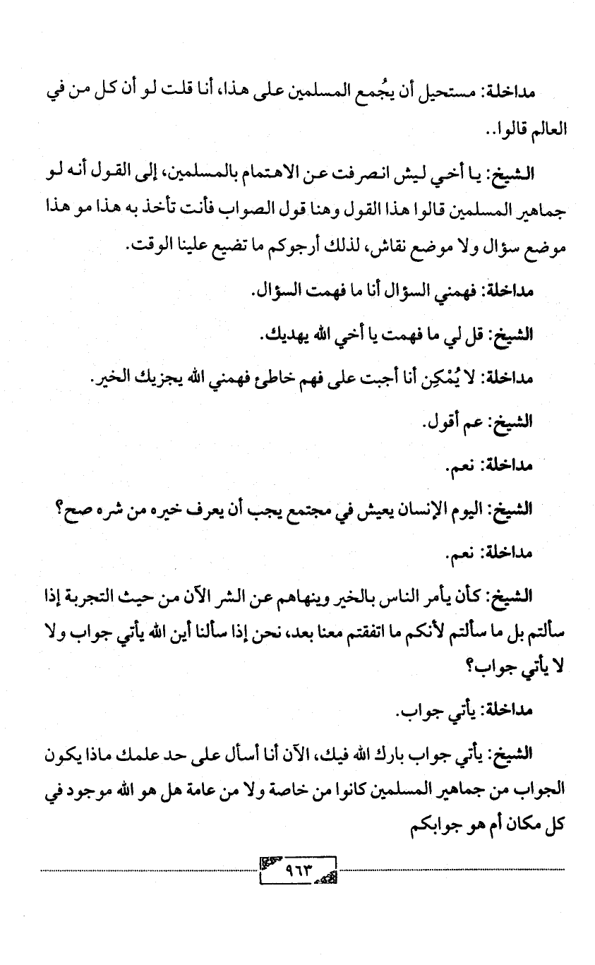 الشيخ: يا أخي ليش انصرفت عن الاهتمام بالمسلمين، إلى القول أنه لو جماهير المسلمين قالوا هذا القول وهنا قول الصواب فأنت تأخذ به هذا مو هذا موضع سؤال ولا موضع نقاش، لذلك أرجوكم ما تضيع علينا الوقت.