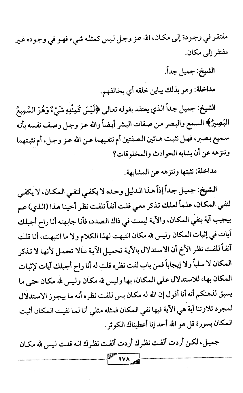 الشيخ: جميل جداً إذاً هذا الدليل وحده لا يكفي لنفي المكان، لا يكفي لنفي المكان، علماً لعلك تذكر معي قلت آنفاً نلفت نظر أخينا هذا (الذي) عم بيجيب آية بنفي المكان، والآية ليست في ذاك الصدد، فأنا جابهته أنا راح أجبلك آيات في إثبات المكان وليس لله مكان انتبهت لهذا الكلام ولا ما انتبهت، أنا قلت آنفاً للفت نظر الأخ أن الاستدلال بالآية تحميل الآية مالا تحمل لأنها لا تذكر المكان لا سلباً ولا إيجاباً فمن باب لفت نظره قلت له أنا راح أجبلك آيات لإثبات المكان بها، للاستدلال على المكان، بها وليس لله مكان وليس لله مكان حتى ما يسبق لذهنكم أنه أنا أقول إن الله له مكان بس للفت نظره أنه ما بيجوز الاستدلال لمجرد تلاوتنا آية هي الآية فيها نفي المكان فمثله مثلي أنا لما نفيت المكان أثبت المكان بسورة قل هو الله أحد إنا أعطيناك الكوثر.