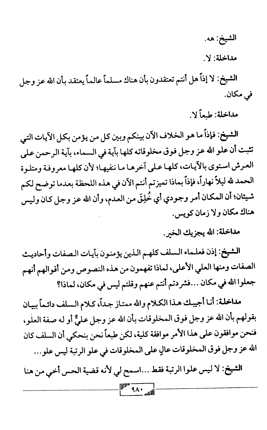 الشيخ: إذن فعلماء السلف كلهم الذين يؤمنون بآيات الصفات وأحاديث الصفات ومنها العلي الأعلى، لماذا تفهمون من هذه النصوص ومن أقوالهم أنهم جعلوا الله في مكان ... فشردتم أنتم عنهم وقلتم ليس في مكان، لماذا؟