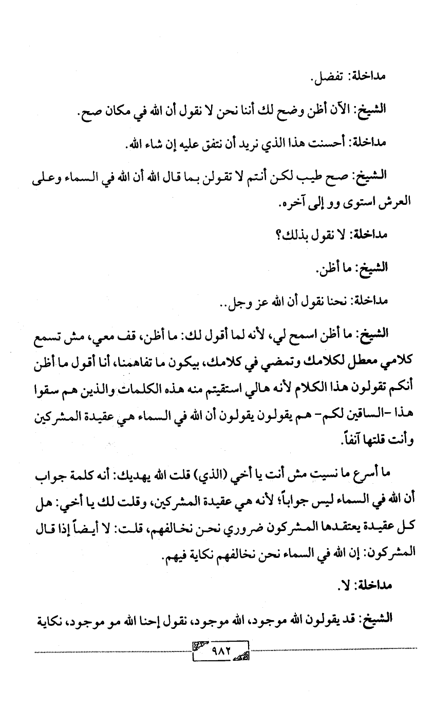 الشيخ: ما أظن اسمح لي، لأنه لما أقول لك: ما أظن، قف معي، مش تسمع كلامي معطل لكلامك وتمضي في كلامك، بيكون ما تفاهمنا، أنا أقول ما أظن أنكم تقولون هذا الكلام لأنه هالي استقيتم منه هذه الكلمات والذين هم سقوا هذا -الساقين لكم- هم يقولون يقولون أن الله في السماء هي عقيدة المشركين وأنت قلتها آنفاً.