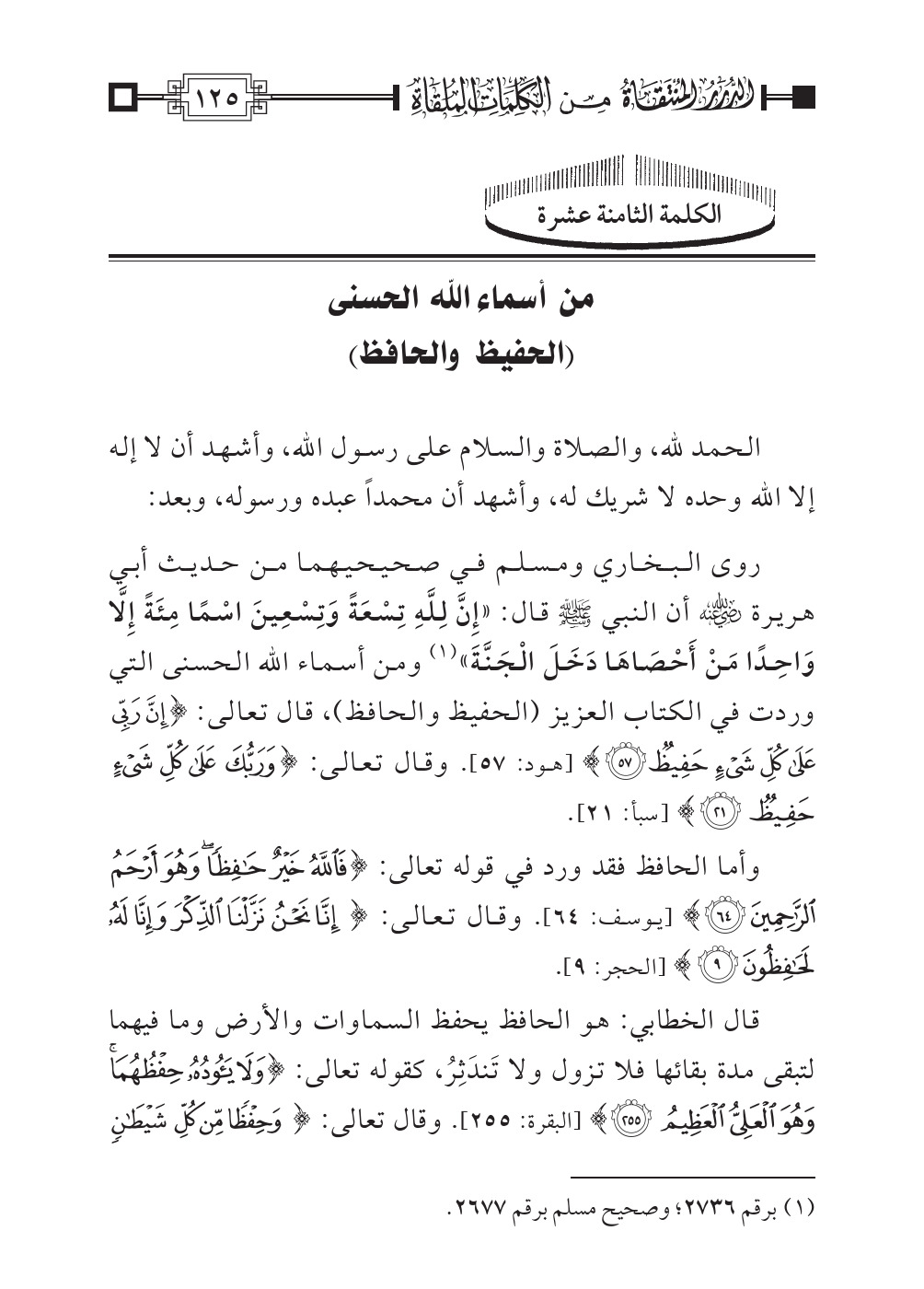 روى البخاري ومسلم في صحيحيهما من حديث أبي هريرة رضي اللهُ عنه أن النبي صلى اللهُ عليه وسلم قال: «إِنَّ لِلَّهِ تِسْعَةً وَتِسْعِينَ اسْمًا مِئَةً إِلَّا وَاحِدًا مَنْ أَحْصَاهَا دَخَلَ الْجَنَّةَ» (¬١) ومن أسماء الله الحسنى التي وردت في الكتاب العزيز (الحفيظ والحافظ)، قال تعالى: {إِنَّ رَبِّي عَلَىَ كُلِّ شَيْءٍ حَفِيظ} [هود: ٥٧]. وقال تعالى: {وَرَبُّكَ عَلَى كُلِّ شَيْءٍ حَفِيظ} [سبأ: ٢١].