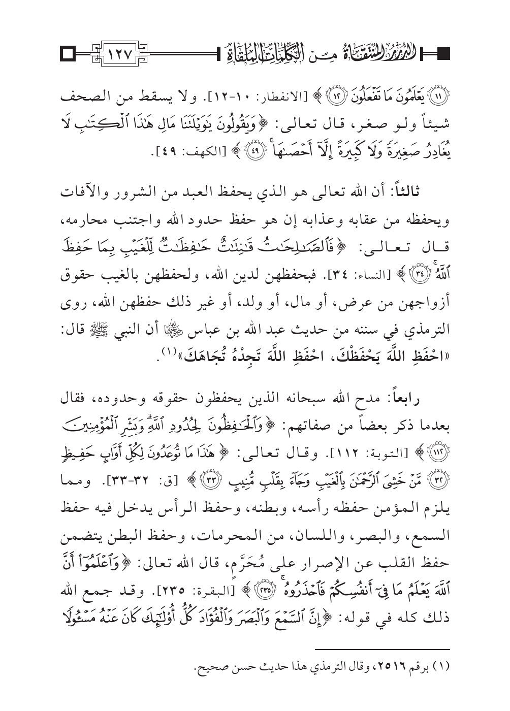 رابعاً: مدح الله سبحانه الذين يحفظون حقوقه وحدوده، فقال بعدما ذكر بعضاً من صفاتهم: {وَالْحَافِظُونَ لِحُدُودِ اللهِ وَبَشِّرِ الْمُؤْمِنِين} [التوبة: ١١٢]. وقال تعالى: {هَذَا مَا تُوعَدُونَ لِكُلِّ أَوَّابٍ حَفِيظ (٣٢) مَنْ خَشِيَ الرَّحْمَن بِالْغَيْبِ وَجَاء بِقَلْبٍ مُّنِيب (٣٣)} [ق: ٣٢ - ٣٣]. ومما يلزم المؤمن حفظه رأسه، وبطنه، وحفظ الرأس يدخل فيه حفظ السمع، والبصر، واللسان، من المحرمات، وحفظ البطن يتضمن حفظ القلب عن الإصرار على مُحَرَّمٍ، قال الله تعالى: {أَنَّ اللهَ يَعْلَمُ مَا فِي أَنفُسِكُمْ فَاحْذَرُوهُ} [البقرة: ٢٣٥]. وقد جمع الله ذلك كله في قوله: {إِنَّ السَّمْعَ وَالْبَصَرَ وَالْفُؤَادَ كُلُّ أُولئِكَ كَانَ عَنْهُ مَسْؤُولا}