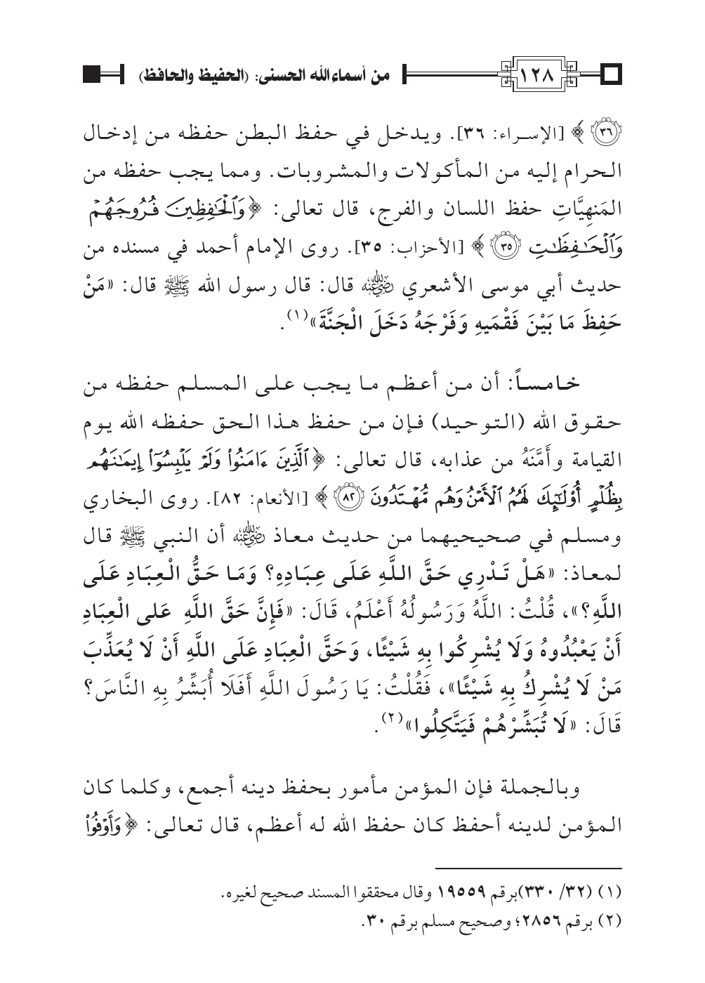 [الإسراء: ٣٦]. ويدخل في حفظ البطن حفظه من إدخال الحرام إليه من المأكولات والمشروبات. ومما يجب حفظه من المَنهِيَّاتِ حفظ اللسان والفرج، قال تعالى: {وَالْحَافِظِينَ فُرُوجَهُمْ وَالْحَافِظَاتِ} [الأحزاب: ٣٥]. روى الإمام أحمد في مسنده من حديث أبي موسى الأشعري رضي اللهُ عنه قال: قال رسول الله صلى اللهُ عليه وسلم قال: «مَنْ حَفِظَ مَا بَيْنَ فَقْمَيهِ وَفَرْجَهُ دَخَلَ الْجَنَّةَ» (¬١).