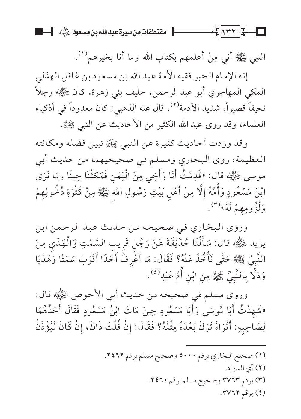 وروى البخاري في صحيحه من حديث عبد الرحمن ابن يزيد رضي اللهُ عنه قال: سَأَلْنَا حُذَيْفَةَ عَنْ رَجُلٍ قَرِيبِ السَّمْتِ وَالْهَدْيِ مِنَ النَّبِيِّ صلى اللهُ عليه وسلم حَتَّى نَاخُذَ عَنْهُ؟ فَقَالَ: مَا أَعْرِفُ أَحَدًا أَقْرَبَ سَمْتًا وَهَدْيًا وَدَلًّا بِالنَّبِيِّ صلى اللهُ عليه وسلم مِنِ ابْنِ أُمِّ عَبْدٍ (¬٤).