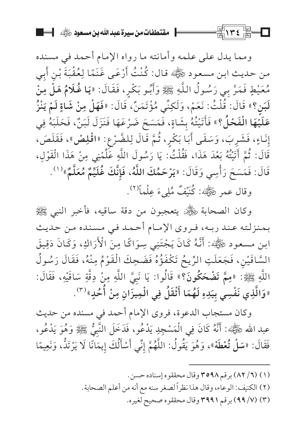 وكان الصحابة رضي الله عنهم يتعجبون من دقة ساقيه، فأخبر النبي صلى اللهُ عليه وسلم بمنزلته عند ربه، فروى الإمام أحمد في مسنده من حديث ابن مسعود رضي اللهُ عنه: أَنَّهُ كَانَ يَجْتَنِي سِوَاكًا مِنَ الْأَرَاكِ، وَكَانَ دَقِيقَ السَّاقَيْنِ، فَجَعَلَتِ الرِّيحُ تَكْفَؤُهُ فَضَحِكَ الْقَوْمُ مِنْهُ، فَقَالَ رَسُولُ اللَّهِ صلى اللهُ عليه وسلم: «مِمَّ تَضْحَكُونَ؟ » قَالُوا: يَا نَبِيَّ اللَّهِ مِنْ دِقَّةِ سَاقَيْهِ، فَقَالَ: «وَالَّذِي نَفْسِي بِيَدِهِ لَهُمَا أَثْقَلُ فِي الْمِيزَانِ مِنْ أُحُدٍ» (¬٣).