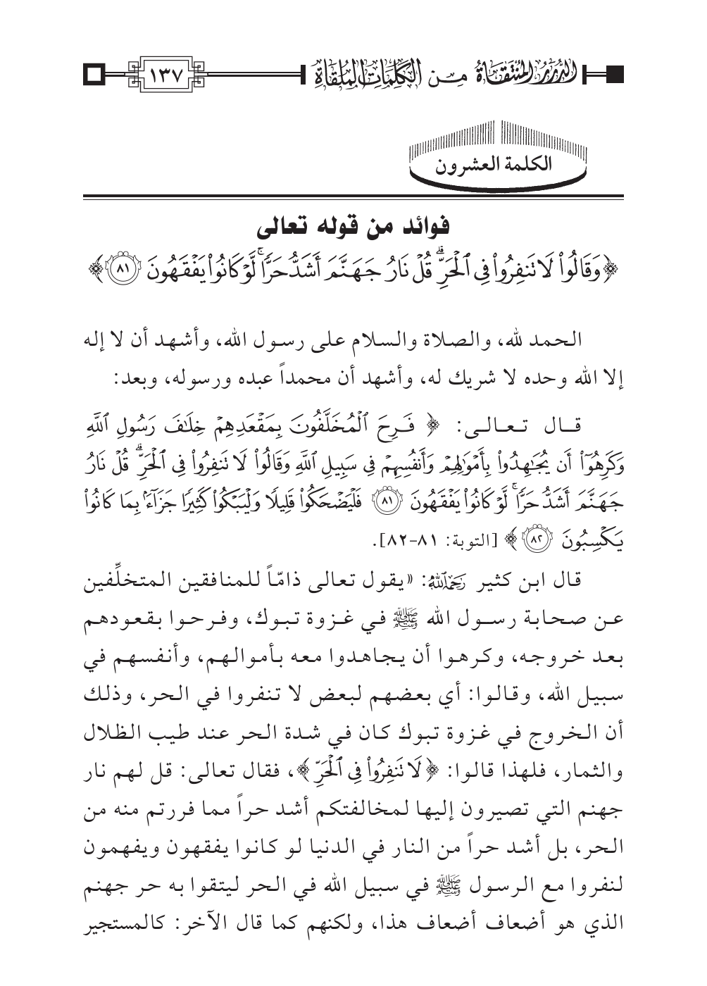 الكلمة العشرون: فوائد من قوله تعالى {وَقَالُوا لَا تَنفِرُوا فِي الْحَرِّ قُلْ نَارُ جَهَنَّمَ أَشَدُّ حَرًّا لَّوْ كَانُوا يَفْقَهُون}